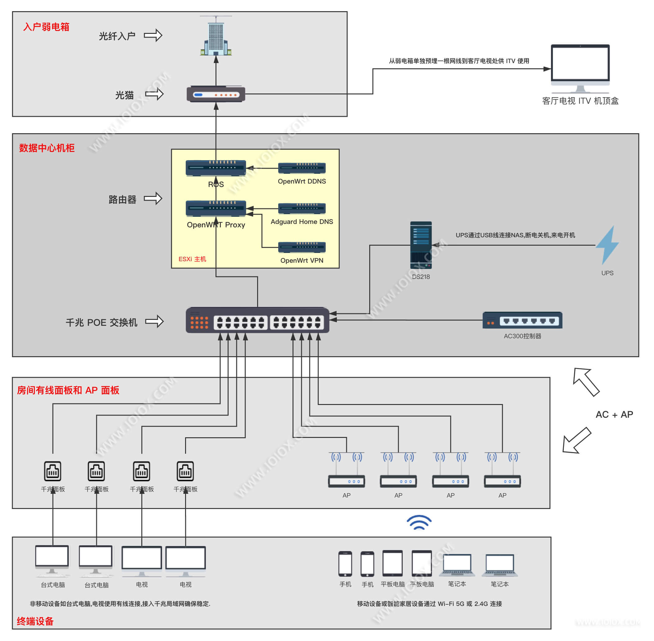 根据拓扑图可以看出,博主规划的物理位置分为三大块,分别为弱电箱,数据中心机柜.各房间有线面板,需要提前考虑好每个地方需要放置什么设备.例如,电脑,NAS,打印机,电视,各种电视盒子,游戏机等等.甚至要为未来 10 年打算购买的设备留好多余的接口,也可作为冗余备用.